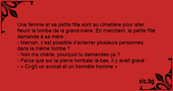 Une femme et sa petite fille sont au cimetière pour aller fleurir la tombe de la grand-mère. En marchant, la petite fille demande à sa mère :