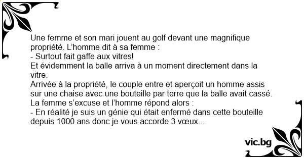 - En réalité je suis un génie qui était enfermé dans cette bouteille depuis 1000 ans donc je vous accorde 3 vœux mais étant donné que nous sommes 3 j’en garde un pour moi.