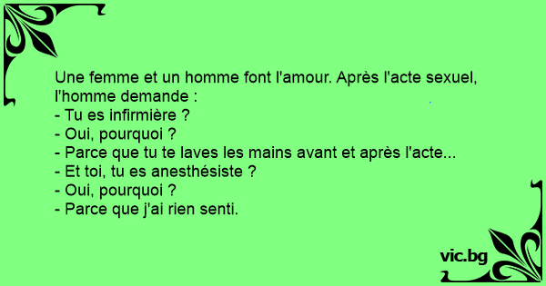 Un couple a fait l'amour pour la première fois. Après tout ça, le mec demande à sa copine qui va se laver les mains : - Dis-moi, tu voudrais être infirmière plus tard ? - Non. Pourquoi ? - Parce...