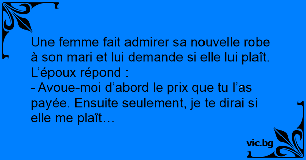 - Avoue-moi d’abord le prix que tu l’as payée. Ensuite seulement, je te dirai si elle me plaît…
