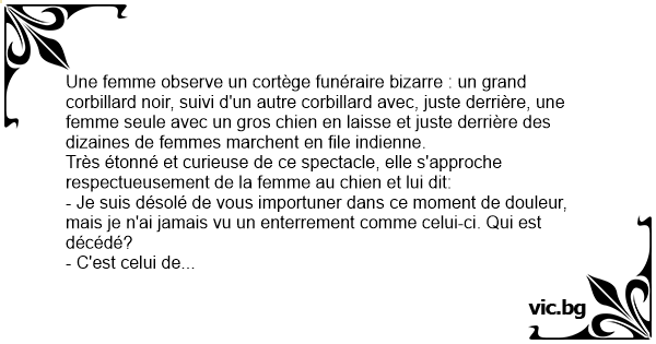 Trece pe strada un cortegiu funerar foarte ciudat: dupa dric urma un tip, un caine fioros si, la mare distanta vreo cincizeci de oameni. Un tip se apropie si intreaba: - Cine a murit ? -...