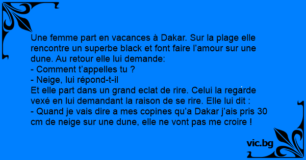 Une femme part en vacances à Dakar. Sur la plage elle rencontre un superbe black et font faire l’amour sur une dune. Au retour elle lui demande: