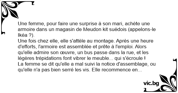 Une femme, pour faire une surprise à son mari, achète une armoire dans un magasin de Meudon kit suédois (appelons-le Ikéa ?).