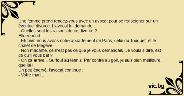 Une femme prend rendez-vous avec un avocat pour se renseigner sur un éventuel divorce. L'avocat lui demande :