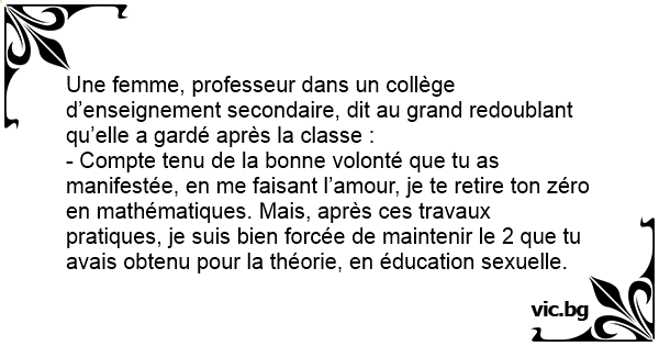- Compte tenu de la воnnе volonté que tu as manifestée, en me faisant l’amour, je te retire ton zéro en mathématiques. Mais, après ces travaux pratiques, je suis bien forcée de maintenir le 2 que tu avais obtenu pour la théorie, en éducation sexuelle.