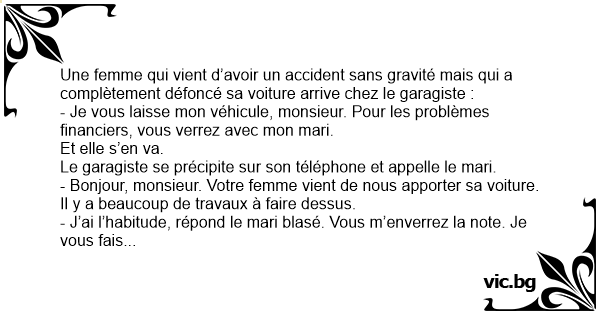 Une femme qui vient d’avoir un accident sans gravité mais qui a complètement défoncé sa voiture arrive chez le garagiste :