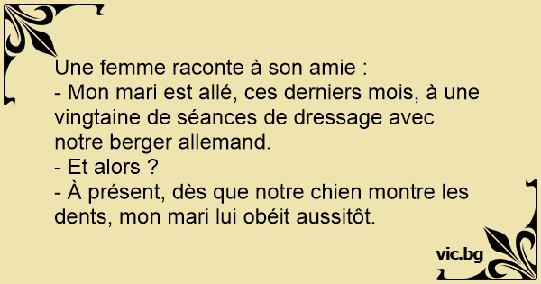 - À présent, dès que notre chien montre les dents, mon mari lui obéit aussitôt.