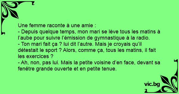 - Ton mari fait ça ? lui dit l’autre. Mais je croyais qu’il détestait le sport ? Alors, comme ça, tous les matins, il fait les exercices ?
