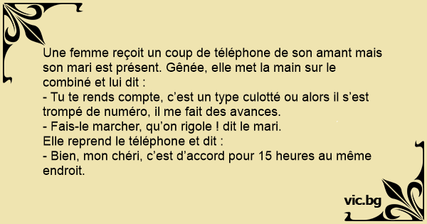 Une femme reçoit un coup de téléphone de son amant mais son mari est présent. Gênée, elle met la main sur le combiné et lui dit :