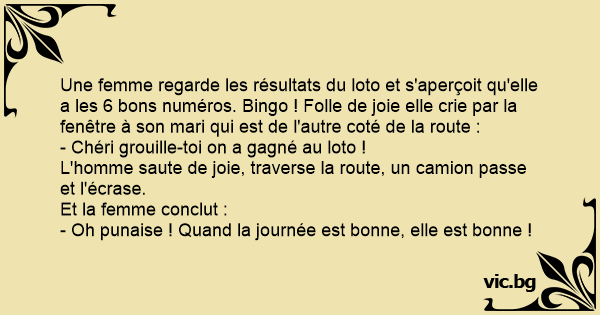 Une femme regarde les résultats du loto et s'aperçoit qu'elle a les 6 bons numéros. Bingo ! Folle de joie elle crie par la fenêtre à son mari qui est de l'autre coté de la route :