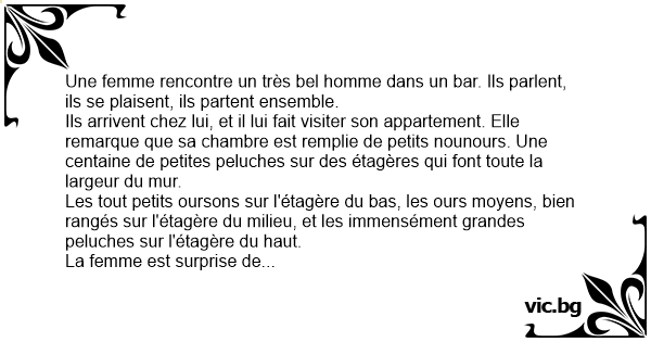 Une femme rencontre un très bel homme dans un bar. Ils parlent, ils se plaisent, ils partent ensemble.
