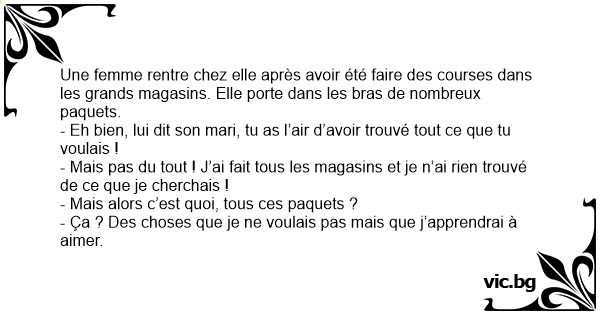 - Eh bien, lui dit son mari, tu as l’air d’avoir trouvé tout ce que tu voulais !