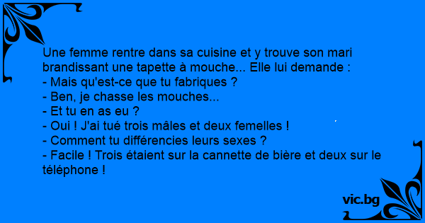 Une femme arrive dans la cuisine et voit son mari avec une tapette à mouche... - Que fais-tu ? Il répond : - Je chasse les mouches... - En as-tu tué ? - Oui, 3 mâles, 2 femelles Intriguée, elle lui...