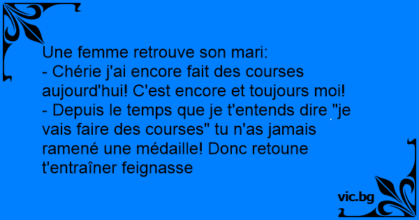 - Depuis le temps que je t'entends dire "je vais faire des courses" tu n'as jamais ramené une médaille! Donc retoune t'entraîner feignasse