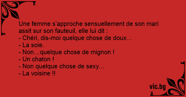 Une femme s’approche sensuellement de son mari assit sur son fauteuil, elle lui dit :