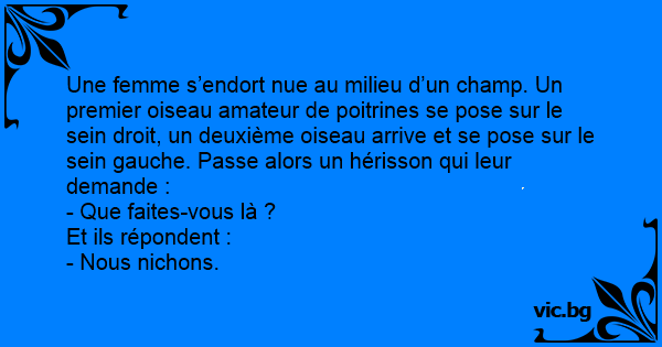 Une femme s’endort nue au milieu d’un champ. Un premier oiseau amateur de poitrines se pose sur le sein droit, un deuxième oiseau arrive et se pose sur le sein gauche. Passe alors un hérisson qui leur demande :