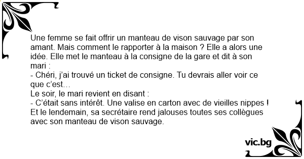 Une femme se fait offrir un manteau de vison sauvage par son amant. Mais comment le rapporter à la maison ? Elle a alors une idée. Elle met le manteau à la consigne de la gare et dit à son mari :