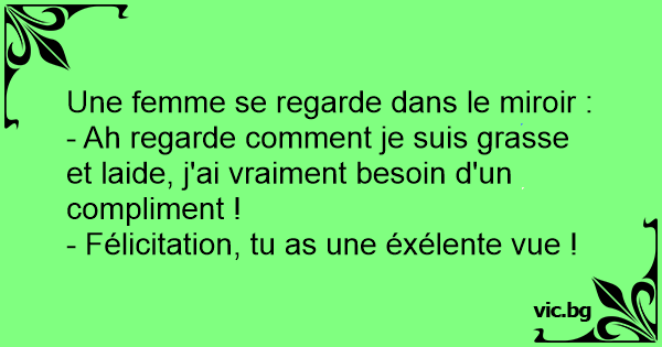 Une femme nue, se regarde debout devant la glace, elle dit à son époux : "Je me trouve horrible à regarder, grasse et ridée... J'ai besoin d'un compliment" Le mari répond : "Tu as une bonne vue !"