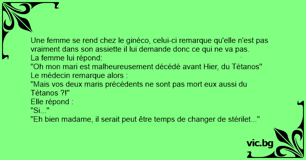 Une femme se rend chez le ginéco, celui-ci remarque qu'elle n'est pas vraiment dans son assiette il lui demande donc ce qui ne va pas. La femme lui répond: "Oh mon mari est malheureusement décédé avant Hier, du Tétanos" Le médecin remarque alors : "Mais vos deux maris précédents ne sont pas mort eux aussi du Tétanos ?!" Elle répond : "Si..." "Eh bien madame, il serait peut être temps de changer de stérilet..."