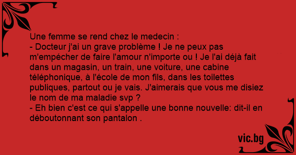 - Docteur j'ai un grave problème ! Je ne peux pas m'empécher de faire l'amour n'importe ou ! Je l'ai déjà fait dans un magasin, un train, une voiture, une cabine téléphonique, à l'école de mon fils, dans les toilettes publiques, partout ou je vais. J'aimerais que vous me disiez le nom de ma maladie svp ?