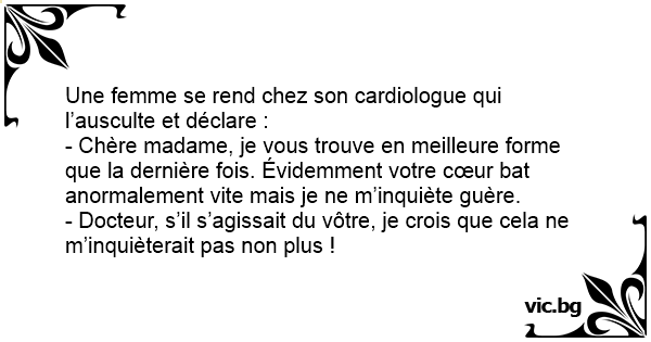 - Chère madame, je vous trouve en meilleure forme que la dernière fois. Évidemment votre cœur bat anormalement vite mais je ne m’inquiète guère.