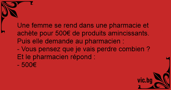 Une femme se rend dans une pharmacie et achète pour 500€ de produits amincissants. Puis elle demande au pharmacien :