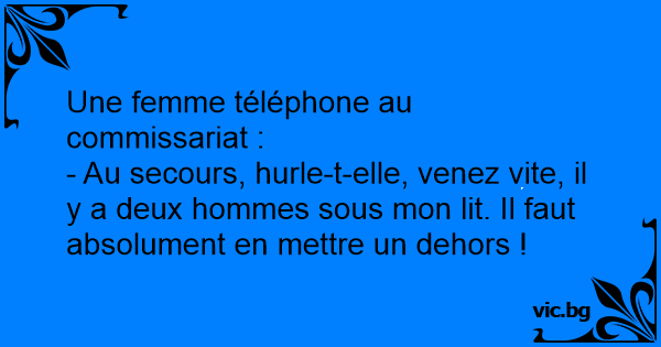 - Au secours, hurle-t-elle, venez vite, il y a deux hommes sous mon lit. Il faut absolument en mettre un dehors !