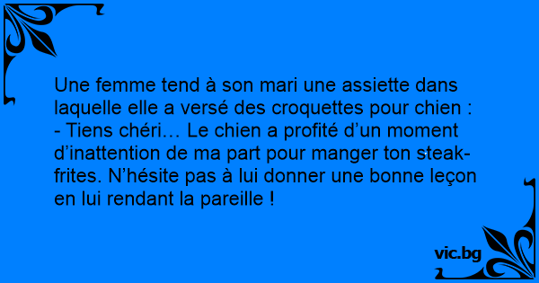 - Tiens chéri… Le chien a profité d’un moment d’inattention de ma part pour manger ton steak-frites. N’hésite pas à lui donner une воnnе leçon en lui rendant la pareille !