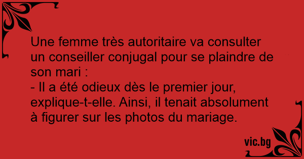 Une femme très autoritaire va consulter un conseiller conjugal pour se plaindre de son mari :