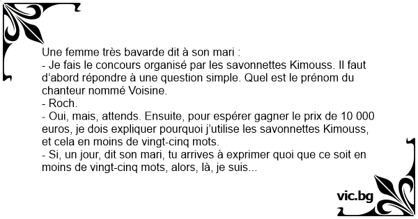 - Oui, mais, attends. Ensuite, pour espérer gagner le prix de 10 000 euros, je dois expliquer pourquoi j’utilise les savonnettes Kimouss, et cela en moins de vingt-cinq mots.