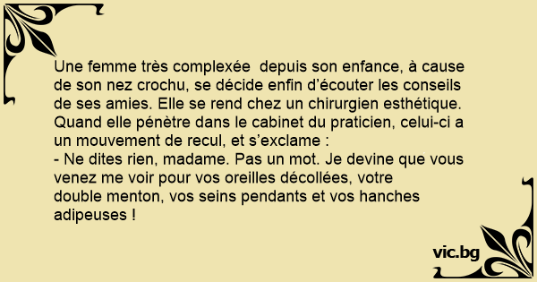 Une femme très complexée  depuis son enfance, à cause de son nez crochu, se décide enfin d’écouter les conseils de ses amies. Elle se rend chez un chirurgien esthétique. Quand elle pénètre dans le cabinet du praticien, celui-ci a un mouvement de recul, et s’exclame :