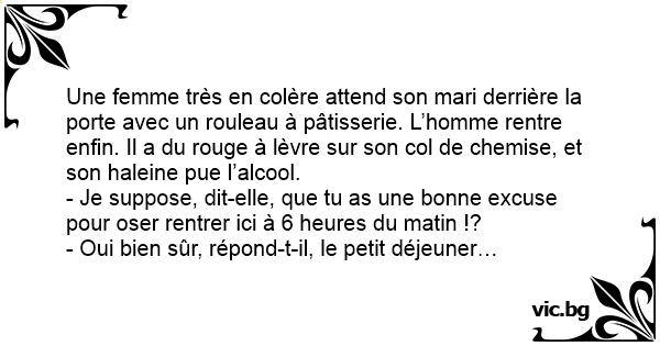- Je suppose, dit-elle, que tu as une воnnе excuse pour oser rentrer ici à 6 heures du matin !?
