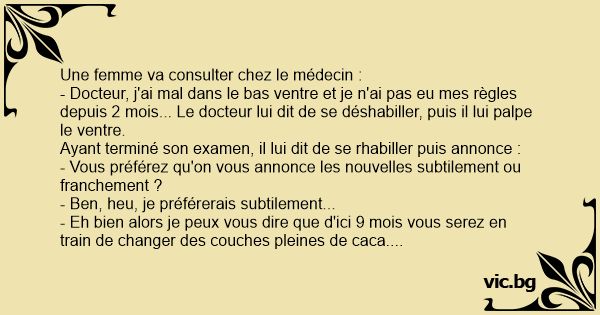 - Docteur, j'ai mal dans le bas ventre et je n'ai pas eu mes règles depuis 2 mois... Le docteur lui dit de se déshabiller, puis il lui palpe le ventre.