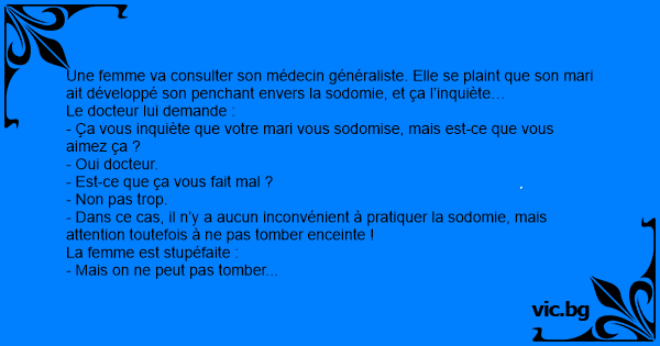 Une femme va consulter son médecin généraliste. Elle se plaint que son mari ait développé son penchant envers la sodomie, et ça l’inquiète…