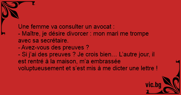 - Maître, je désire divorcer : mon mari me trompe avec sa secrétaire.
