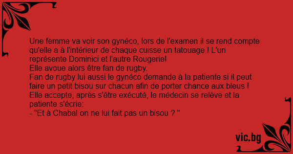 Une femme va voir son gynéco, lors de l'examen il se rend compte qu'elle a à l'intérieur de chaque cuisse un tatouage ! L'un représente Dominici et l'autre Rougerie!