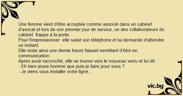 Une femme vient d'être acceptée comme associé dans un cabinet d'avocat et lors de son premier jour de service, un des collaborateurs du cabinet frappe à la porte.
