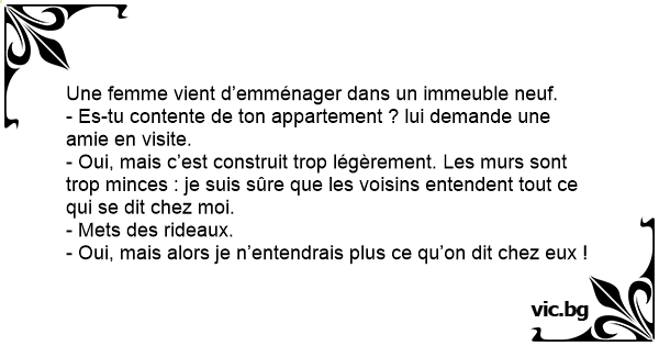 - Oui, mais c’est construit trop légèrement. Les murs sont trop minces : je suis sûre que les voisins entendent tout ce qui se dit chez moi.