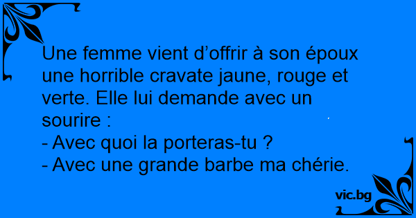 Une femme vient d’offrir à son époux une horrible cravate jaune, rouge et verte. Elle lui demande avec un sourire :