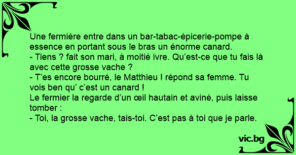 Une fermière entre dans un bar-tabac-épicerie-pompe à essence en portant sous le bras un énorme canard.