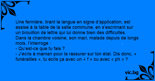 - J’écris à maman pour la rassurer sur ton état. Dis donc, « funérailles », tu écris ça avec un « f » ou avec « ph » ?