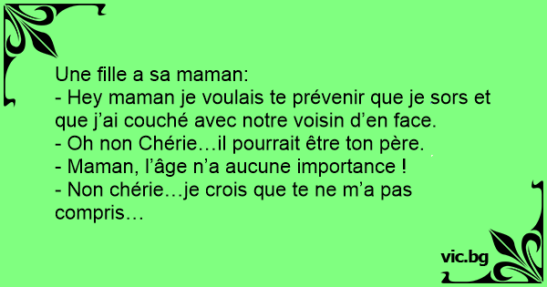 - Hey maman je voulais te prévenir que je sors et que j’ai couché avec notre voisin d’en face.