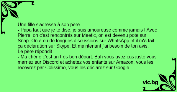 - Papa faut que je te dise, je suis amoureuse comme jamais ! Avec Pierre, on c'est rencontrés sur Meetic, on est devenu pote sur Snap. On a eu de longues discussions sur WhatsApp et il m'a fait ça déclaration sur Skype. Et maintenant j'ai besoin de ton avis.