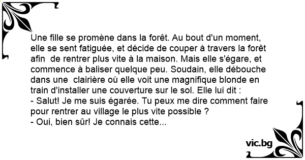 Une fille se promène dans la forêt. Au bout d'un moment, elle se sent fatiguée, et décide de couper à travers la forêt afin de rentrer plus vite à la maison. Mais elle s'égare, et commence à baliser quelque peu. Soudain, elle débouche dans une clairière où elle voit une magnifique blonde en train d'installer une couverture sur le sol. Elle lui dit :