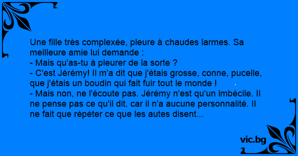 Une fille très complexée, pleure à chaudes larmes. Sa meilleure amie lui demande :