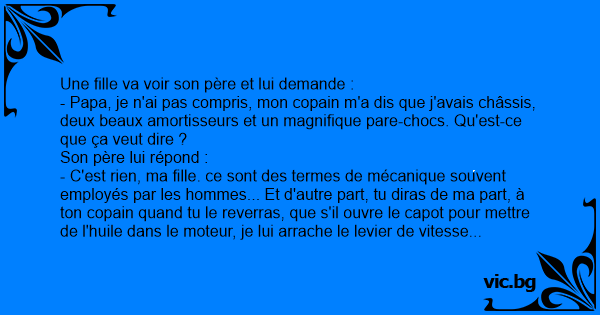 - Papa, je ne comprends pas, mon copain m'a dit que j'avais un joli châssis, deux beaux amortisseurs et un magnifique pare-chocs... - Et bien dis à ton copain, que s'il ouvre le moteur pour y...
