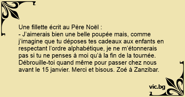 - J’aimerais bien une belle poupée mais, comme j’imagine que tu déposes tes cadeaux aux enfants en respectant l’ordre alphabétique, je ne m’étonnerais pas si tu ne penses à moi qu’à la fin de la tournée. Débrouille-toi quand même pour passer chez nous avant le 15 janvier. Merci et bisous. Zoé à Zanzibar.
