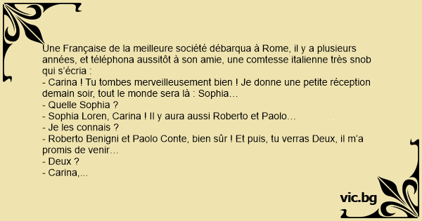 Une Française de la meilleure société débarqua à Rome, il y a plusieurs années, et téléphona aussitôt à son amie, une comtesse italienne très snob qui s’écria :