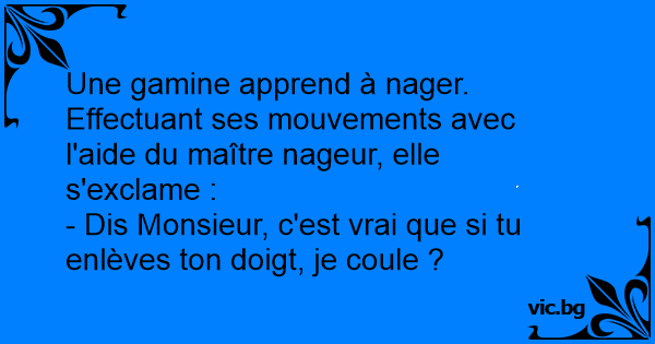 Une gamine apprend à nager. Effectuant ses mouvements avec l'aide du maître nageur, elle s'exclame :
