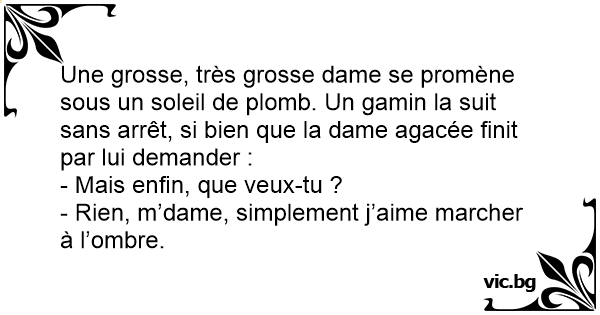 Une grosse, très grosse dame se promène sous un soleil de plomb. Un gamin la suit sans arrêt, si bien que la dame agacée finit par lui demander :